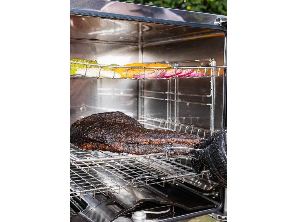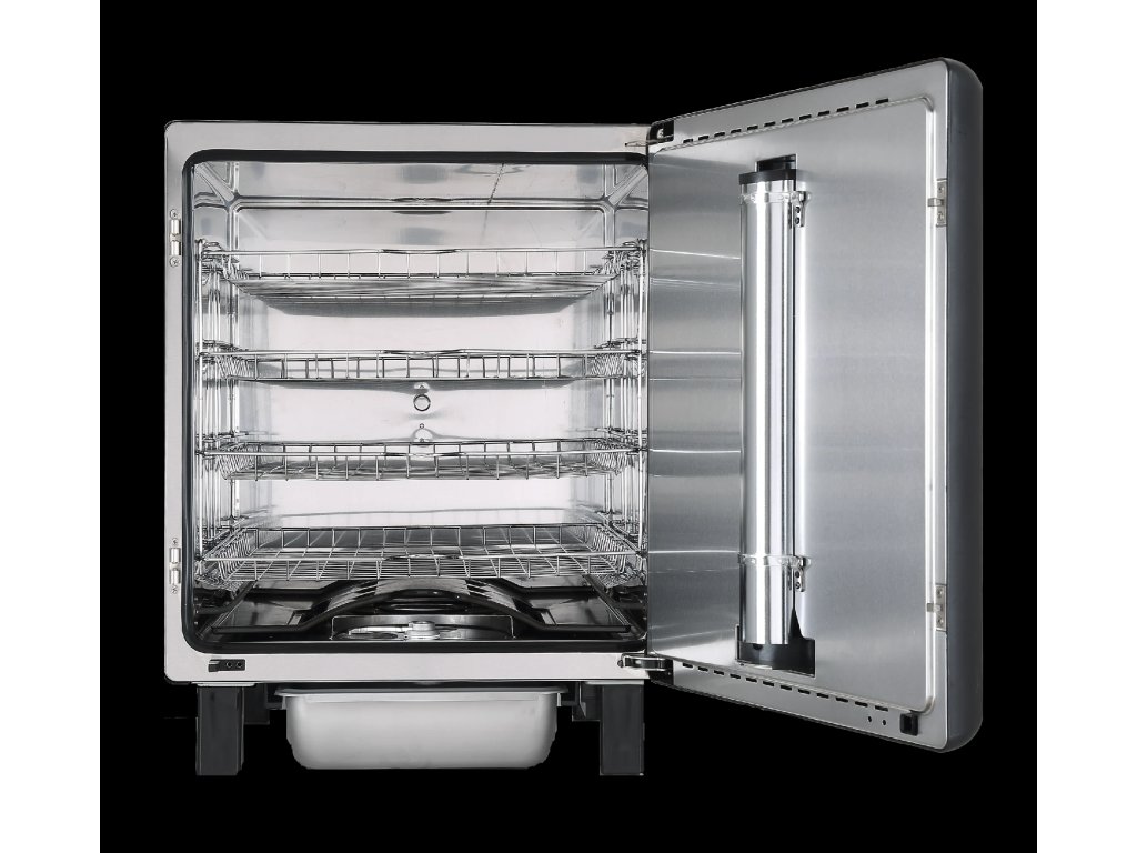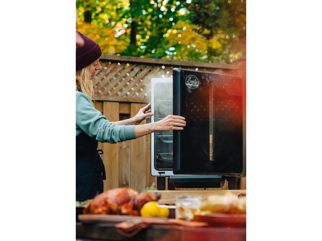 - Ovládání a konektivita: Integrované Bluetooth ovládání umožňuje propojení s aplikací Bradley iSmoke™, což poskytuje možnost vzdáleného nastavení a monitorování udírny. Digitální dotykový panel na přední straně nabízí intuitivní a snadné ovládání.