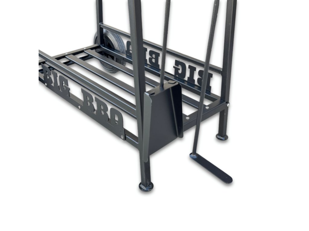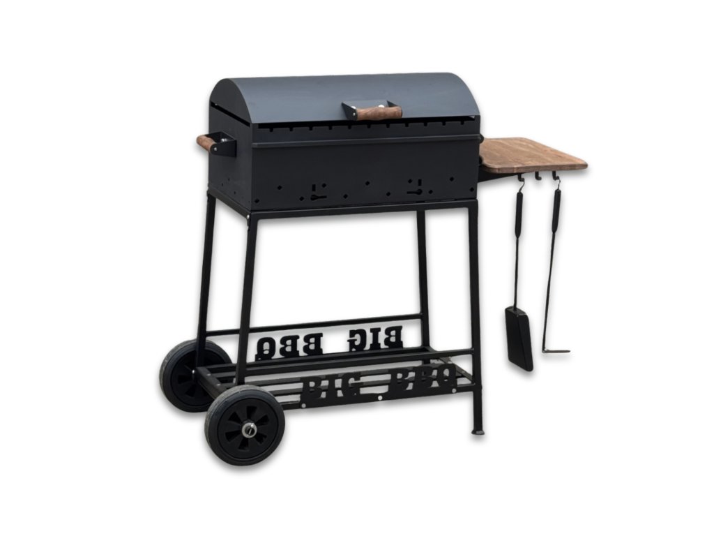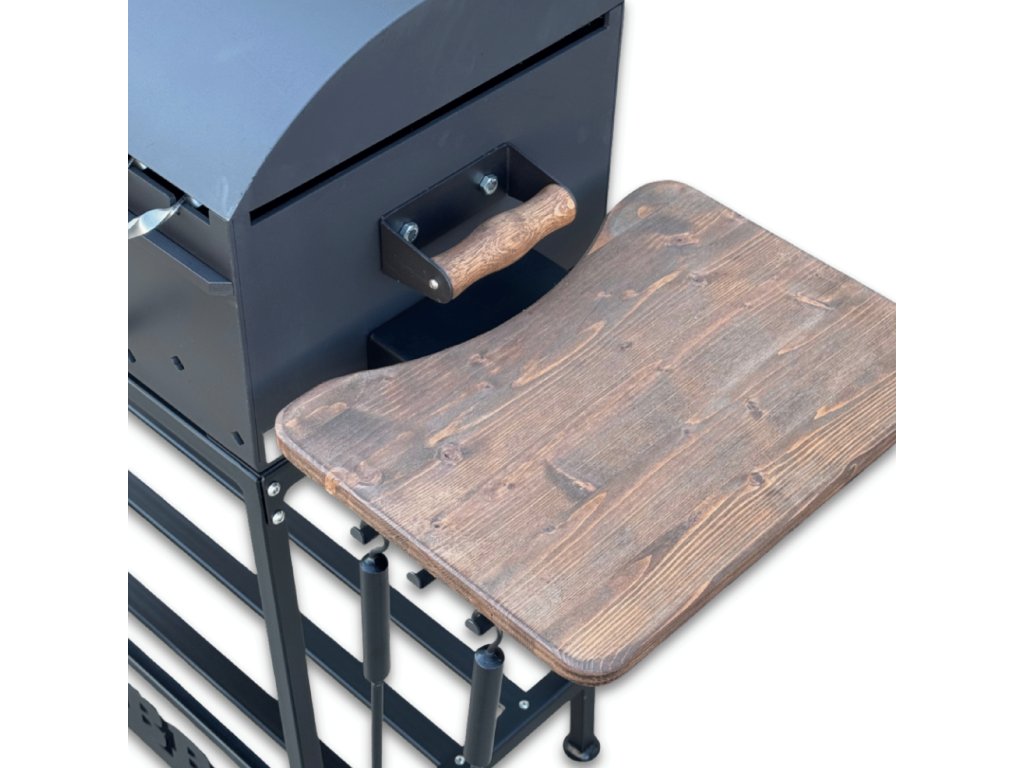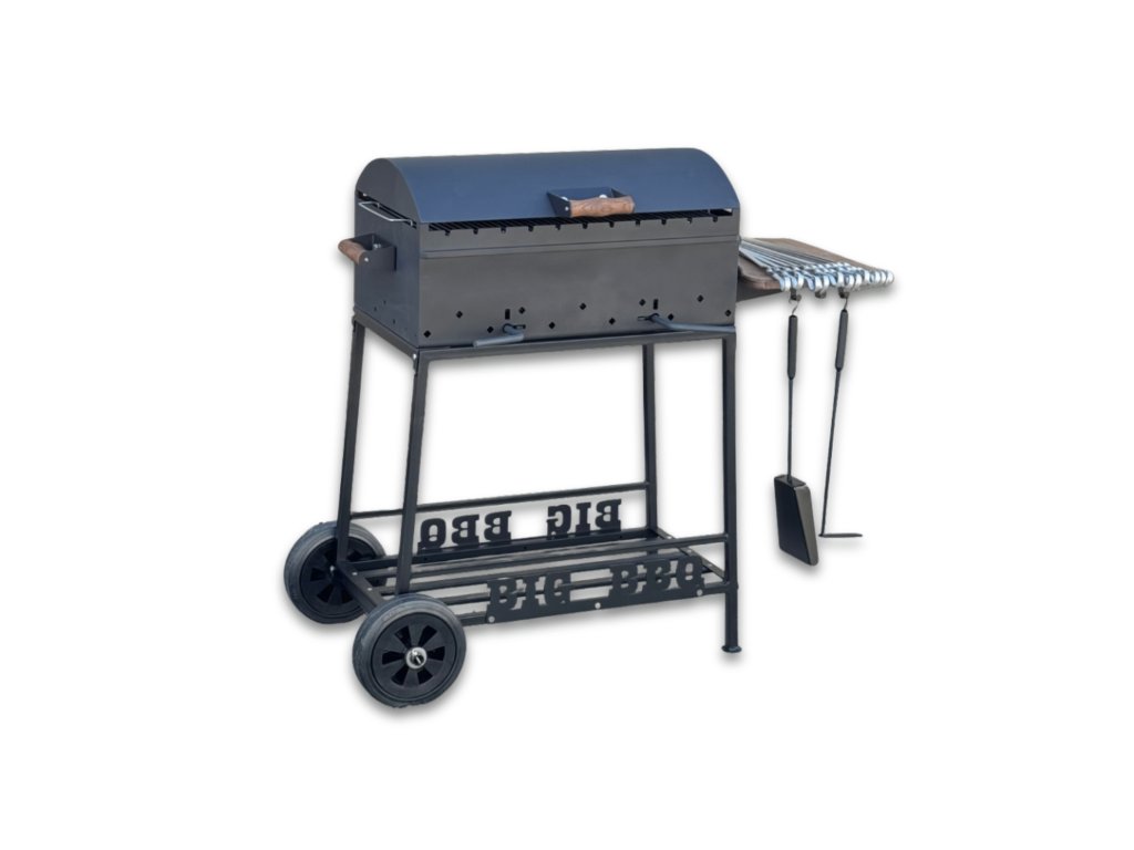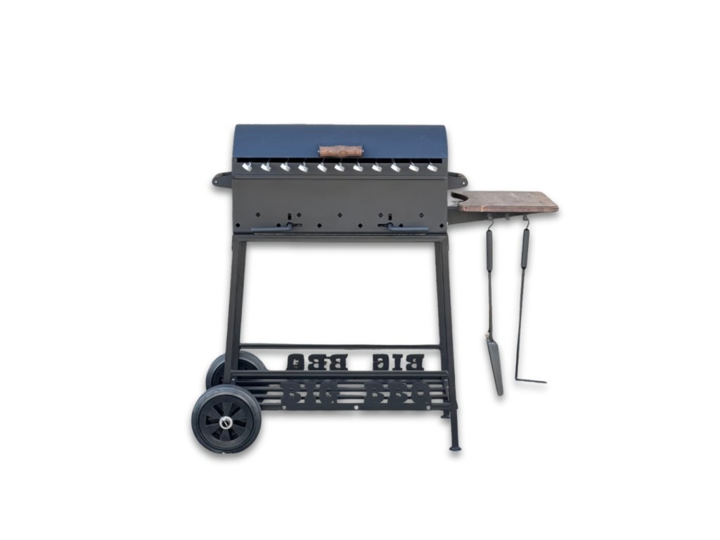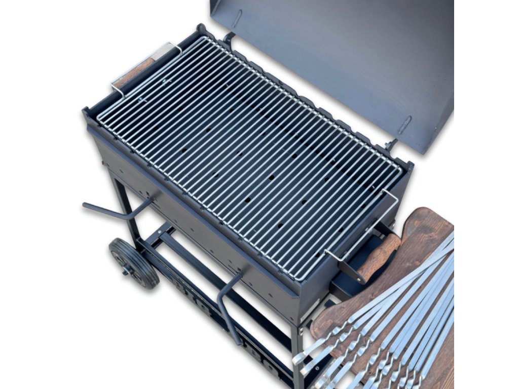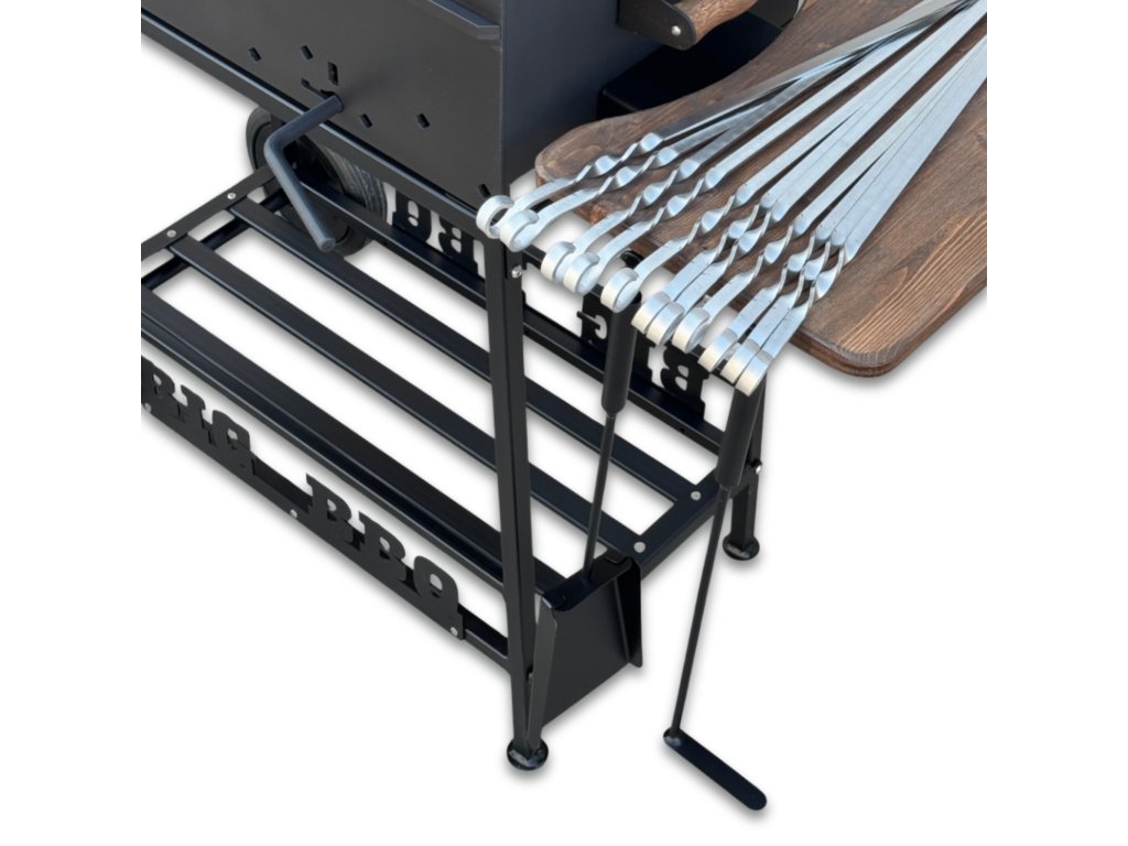 Velký BBQ špízový gril 60cm s policí, grilovacím roštem, zvýšeným druhým dnem, lopatkou a pohrabáčem a se 6 kusy špízů.